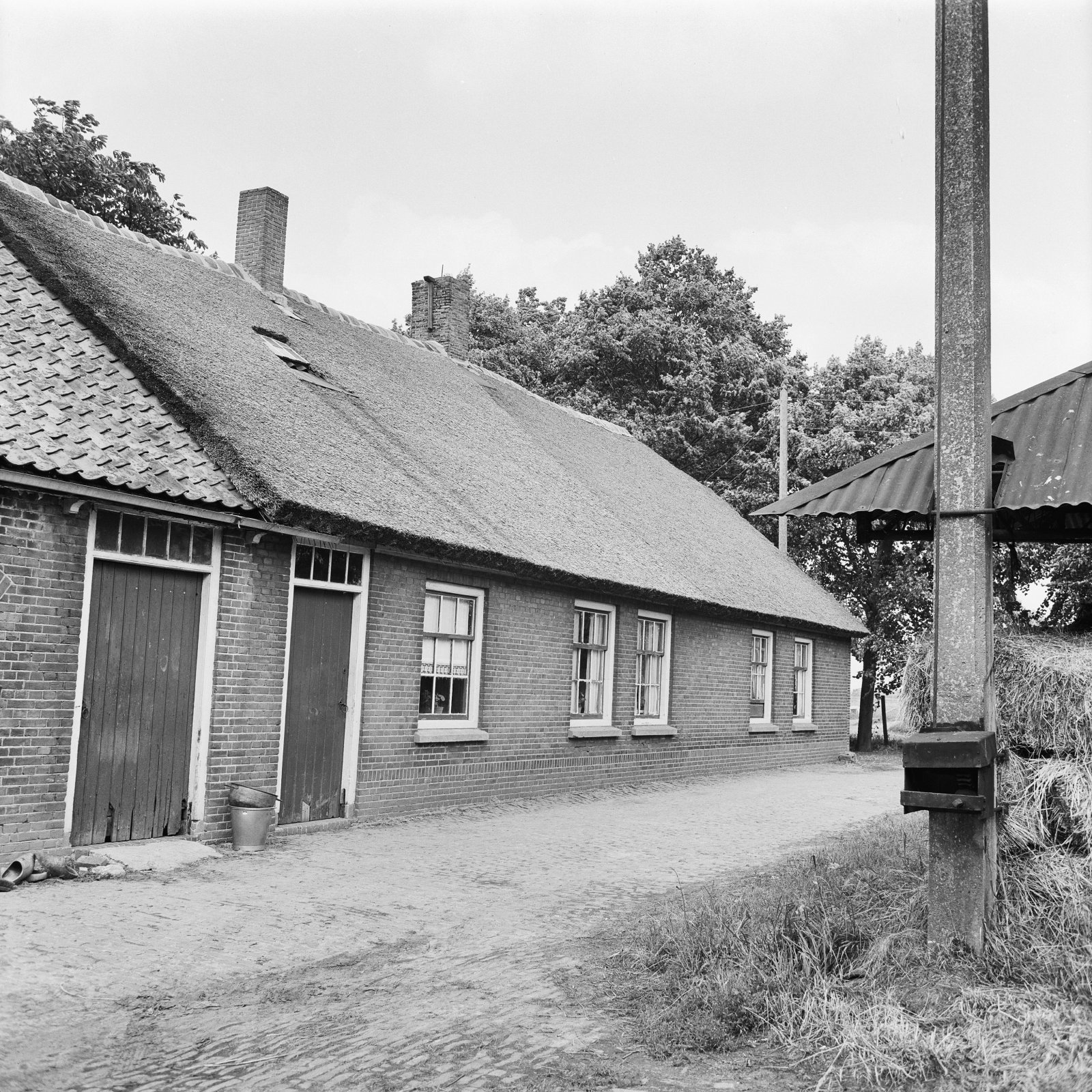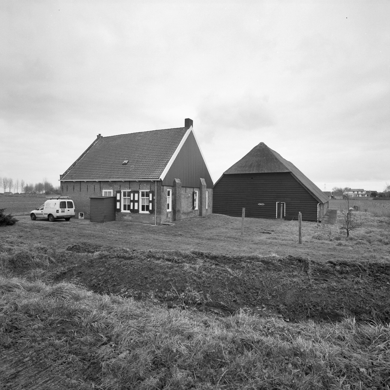 Overzicht van boerderij met dwarsgeplaatst woonhuis ...