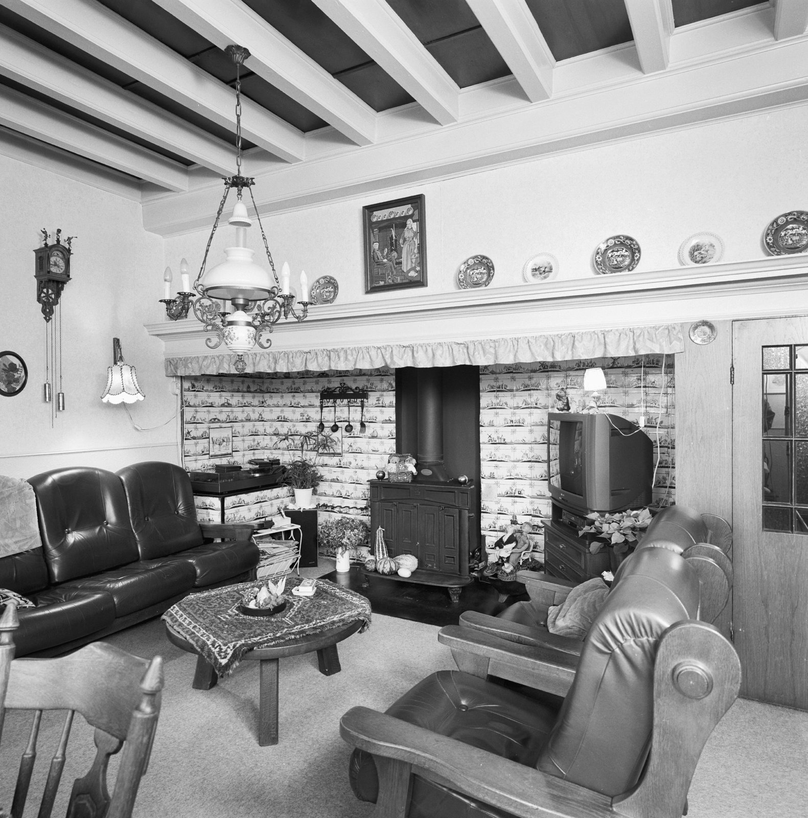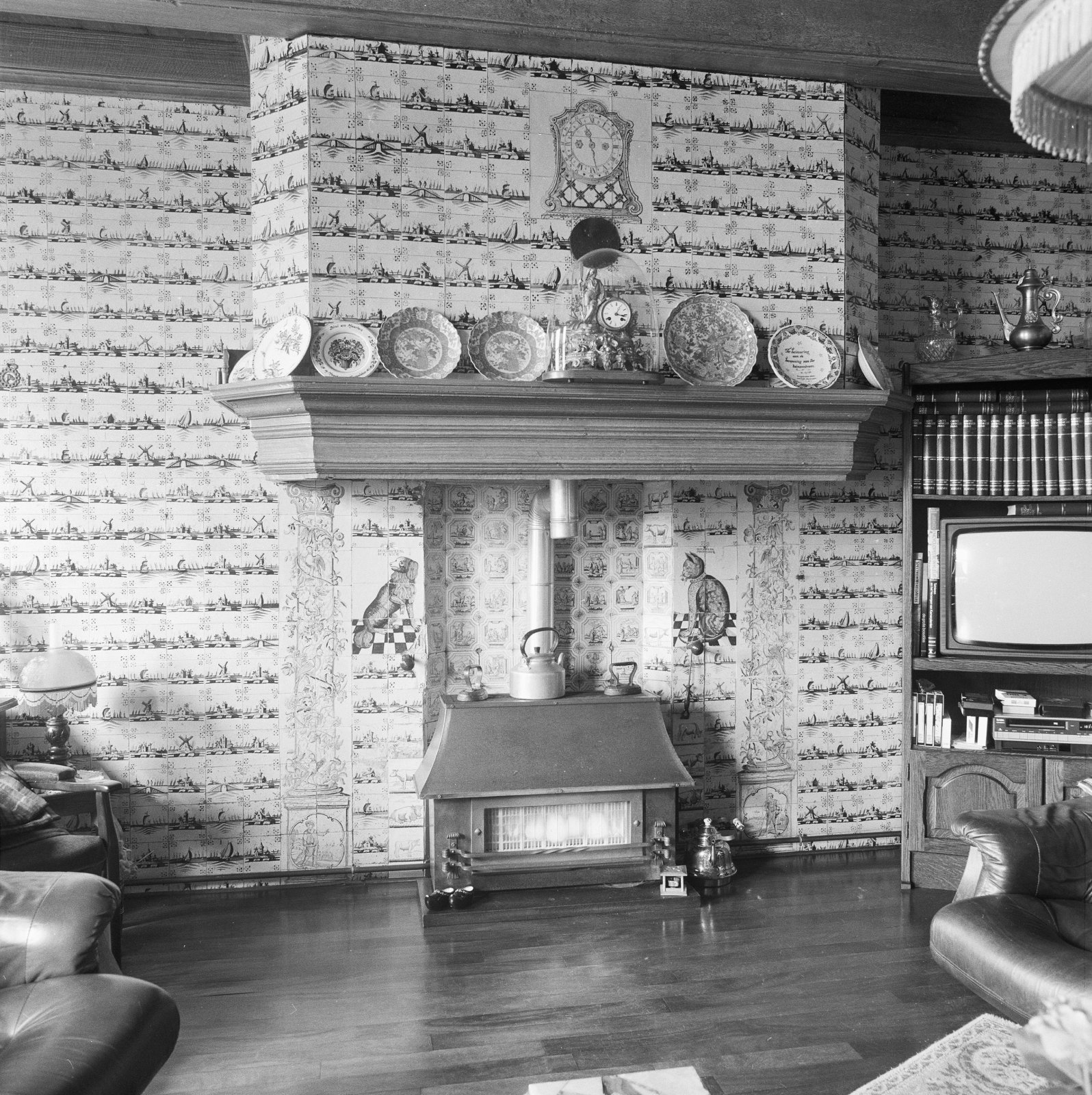 Interieur woonkamer, betegelde schouw in de haard me...