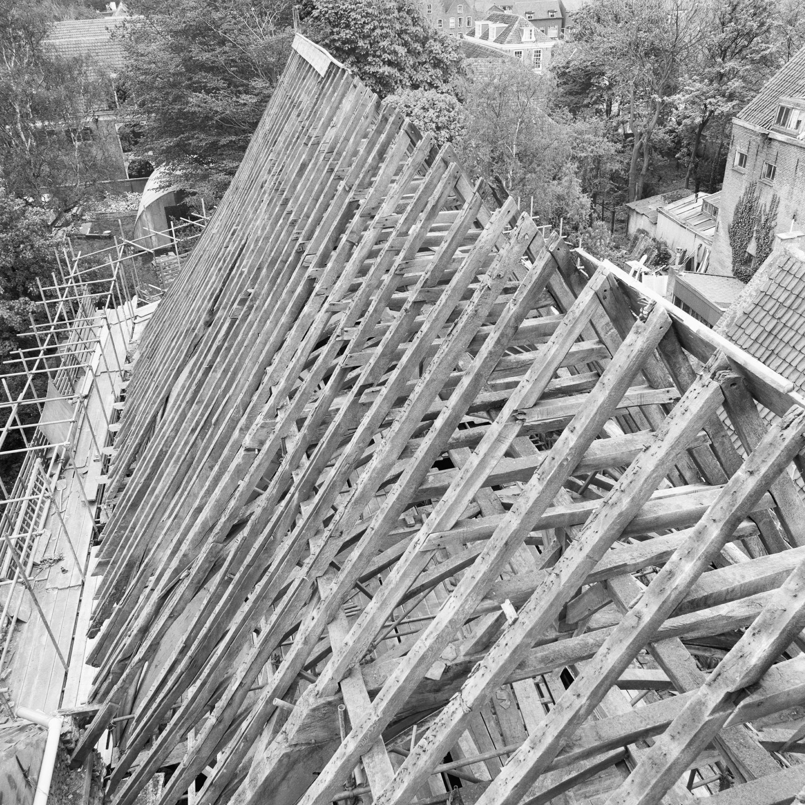 Kerk in de steigers tijdens restauratie: kapconstructie