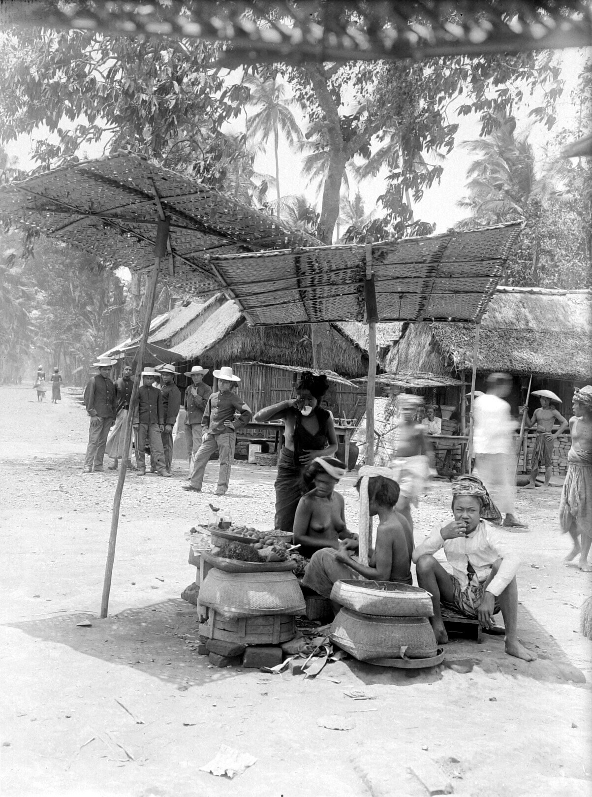 Straatgezicht op Bali met winkels (?), verkoopsters ...
