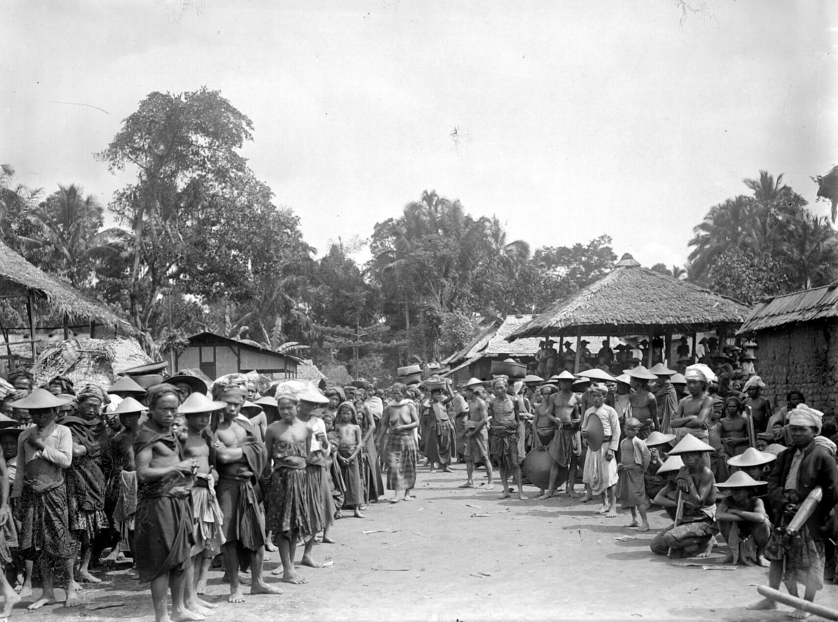 Straatgezicht met waringin op Bali (?)