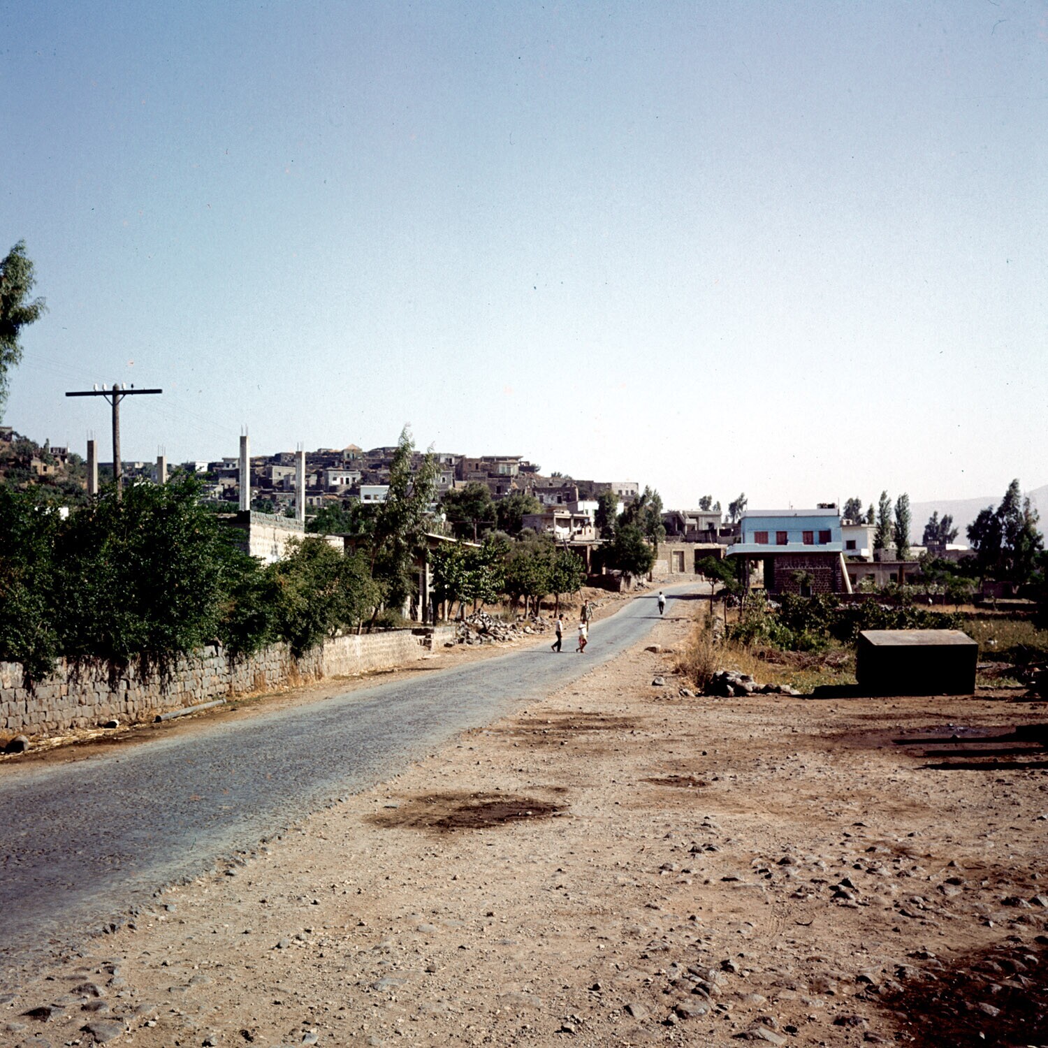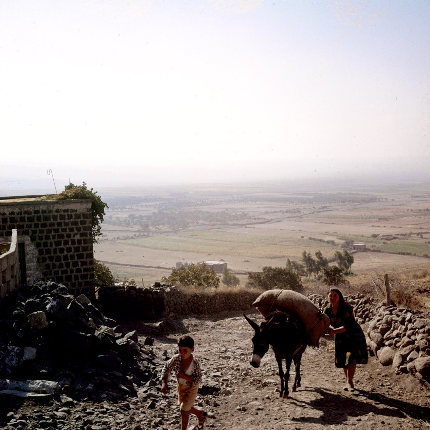 Een vrouw en kind met een bepakte ezel en uitzicht o...