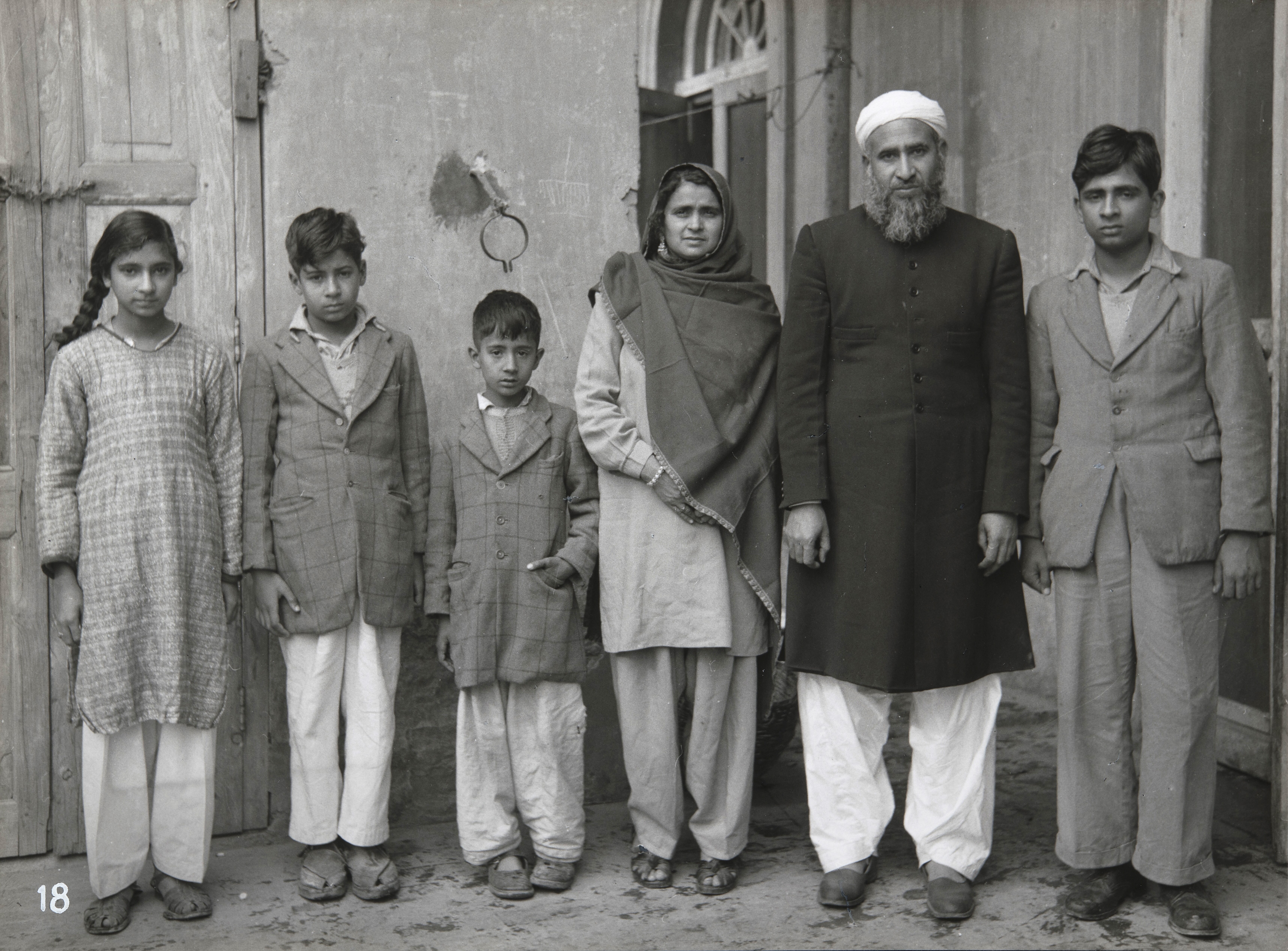 Groepsfoto van vrouwen en kinderen voor een muur