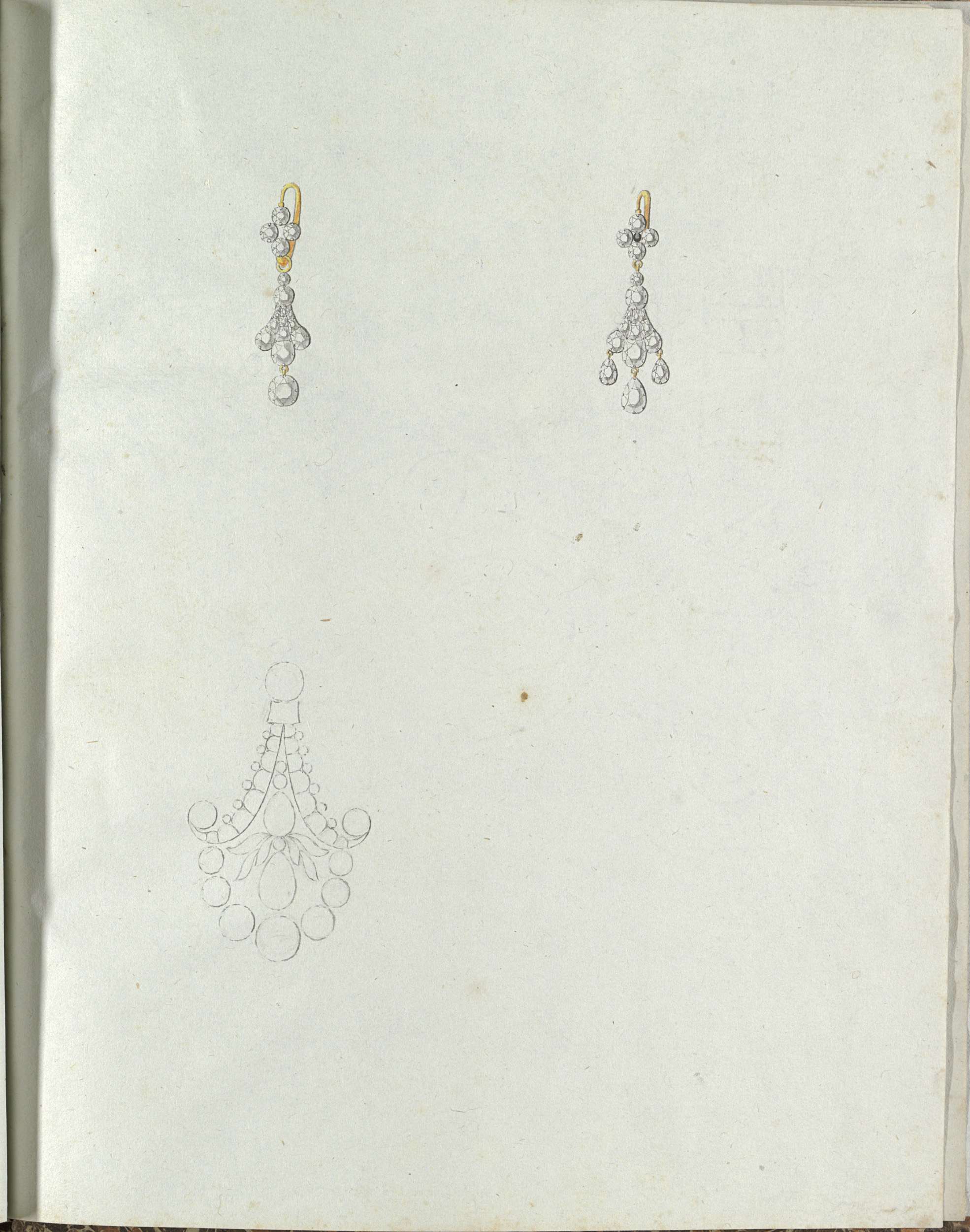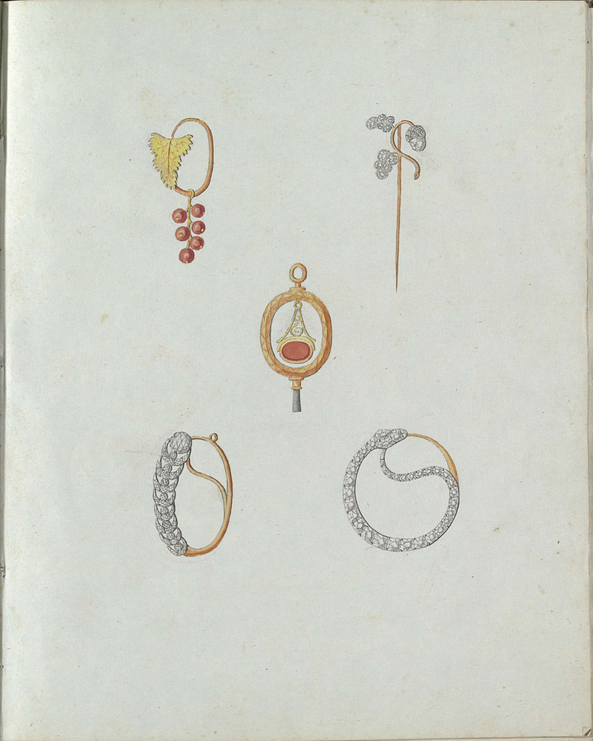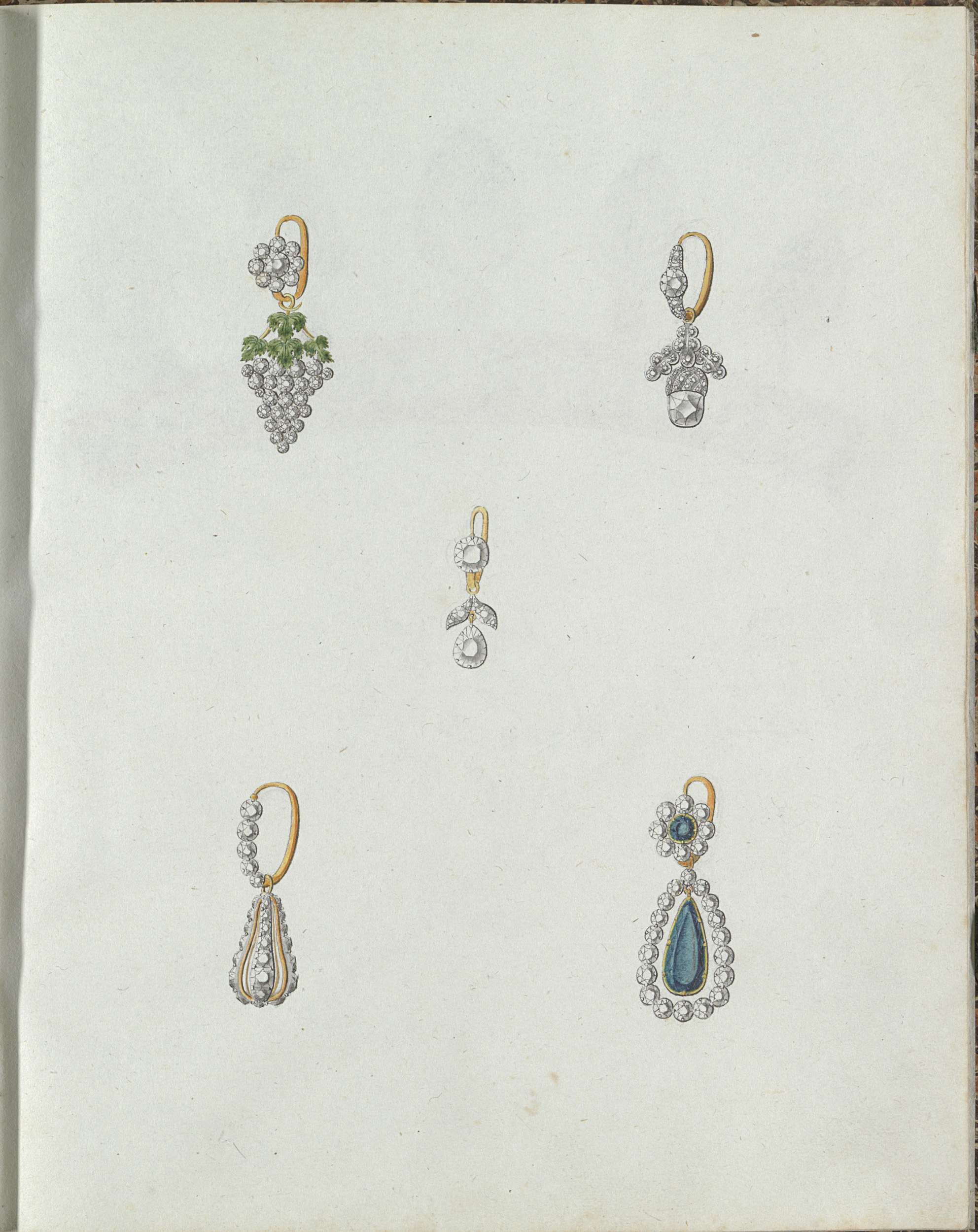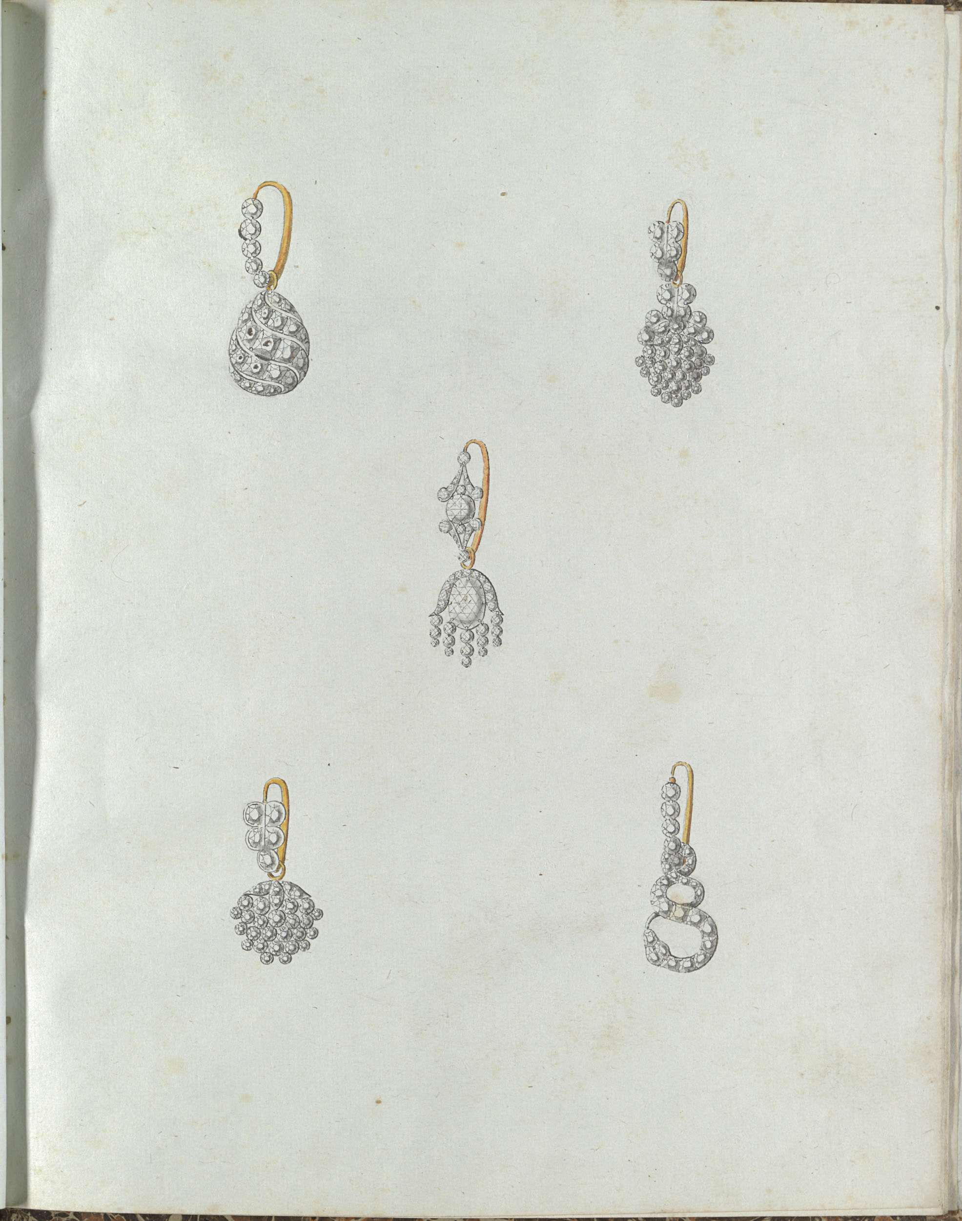 Vijf ontwerpen van oorbellen, waarvan één met een dr...