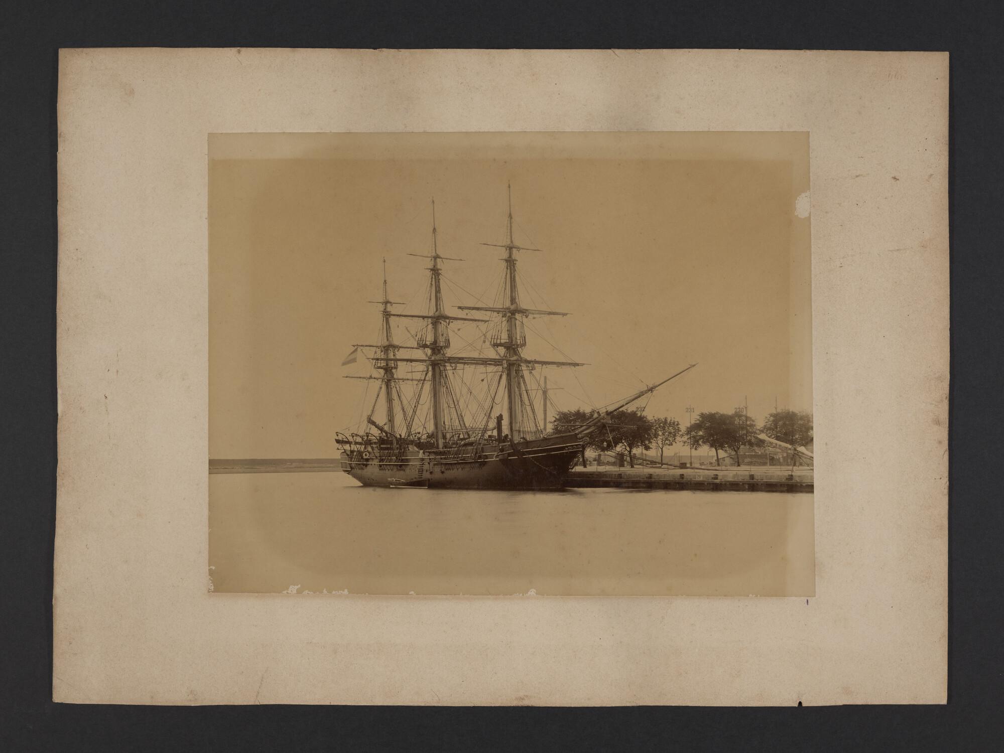 Zwart-wit foto van het opleidingsschip Hr.Ms. Nautil...