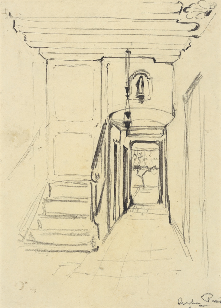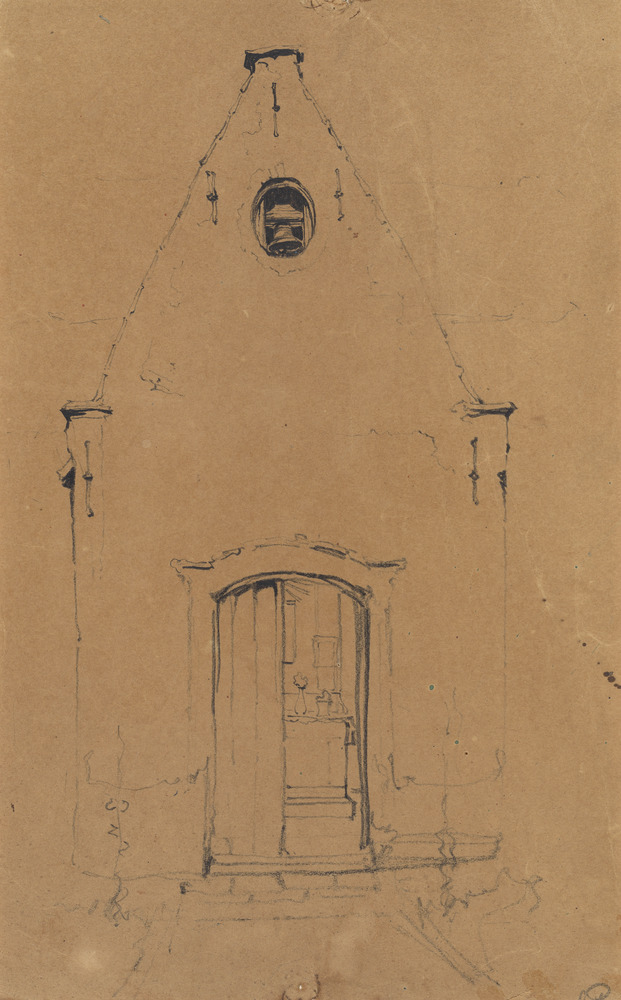Christusbeeld in gotische kerk, reistekening, in conté