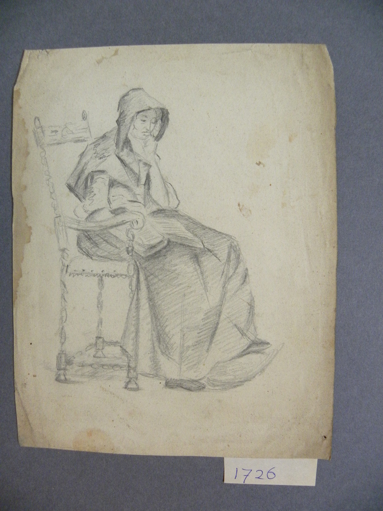 Potloodtekening voorstellende vrouw op stoel, ca. 1870.
