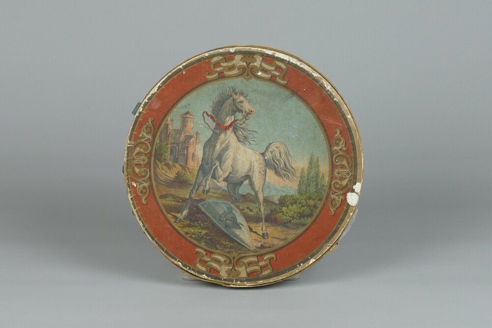 Klok en hamerspel in ronde doos, laat 19e eeuw.