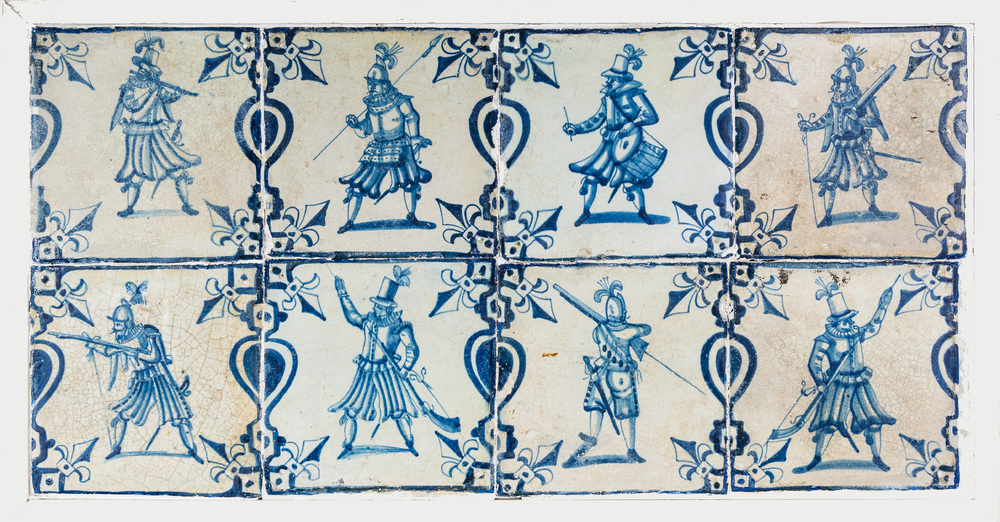 Tegelveld van 8 aardewerken tegels met tinglazuur, 1...