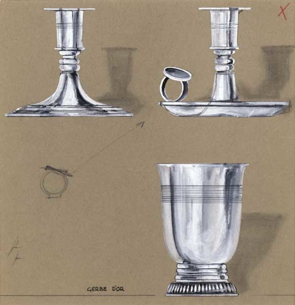 Ontwerptekening in aquarel van 2 kandelaars, een sch...