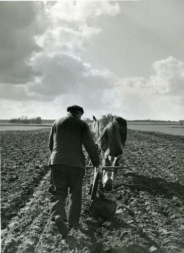 Foto in zwart-wit van ploegen met een houten ploeg d...