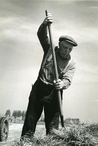 Foto in zwart-wit van het handmatig opladen van hooi...