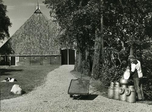 Foto in zwart-wit van het achtererf van een boerderi...