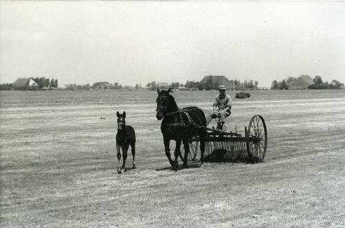 Foto in zwart-wit van een maaimachine met twee paard...