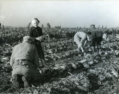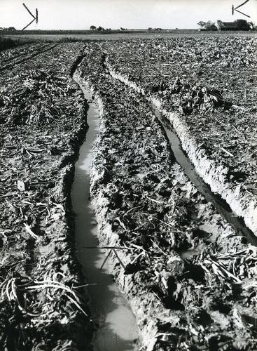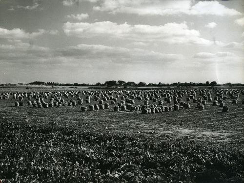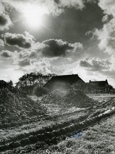 Foto in zwart-wit van hopen gerooide bieten door Joh...
