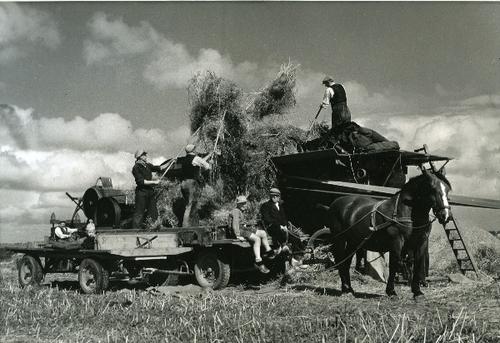 Foto in zwart-wit van een dorsmachine door J.D. de J...