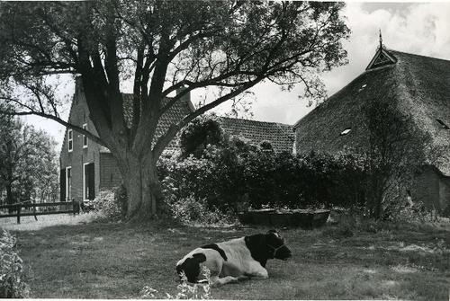 Foto van een liggende stier bij een boerderij door J...