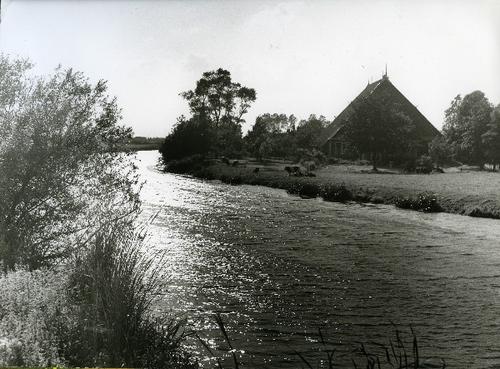 Foto in zwart-wit van een boerderij aan het water bi...