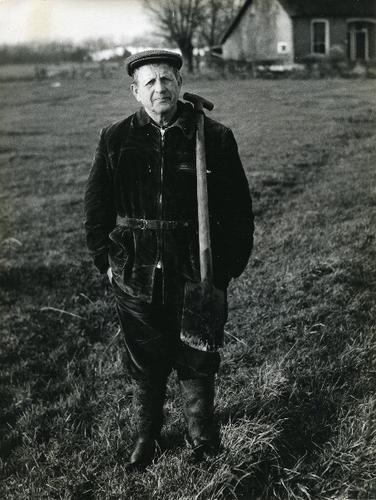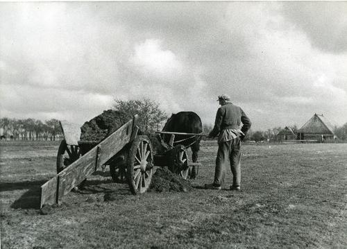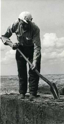 Foto in zwart-wit van een man die hoogveen afsteekt ...