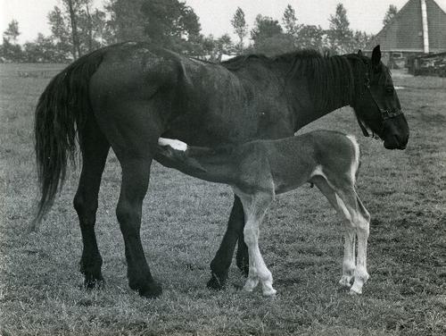 Foto in zwart-wit van een merrie met een veulen door...