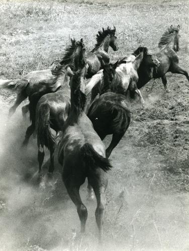 Foto in zwart-wit van galopperende paarden door J.D....