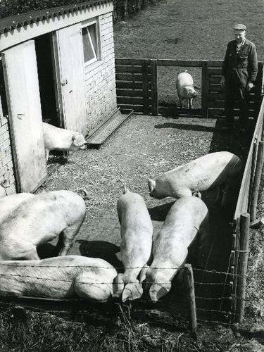 Foto in zwart-wit van varkens in een buitenhok door ...