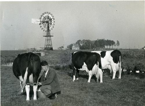 Foto in zwart-wit van handmelken in het weiland door...
