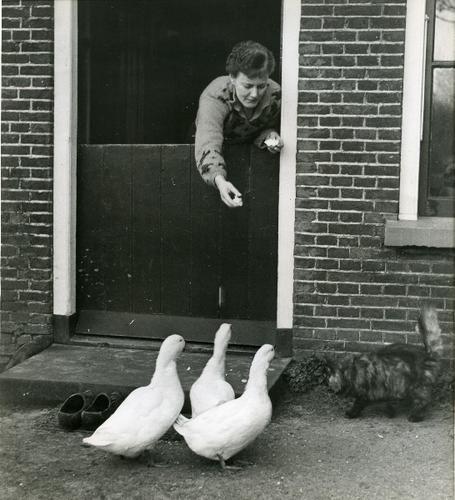 Foto in zwart-wit van een vrouw met eenden bij een d...