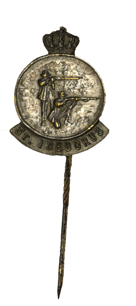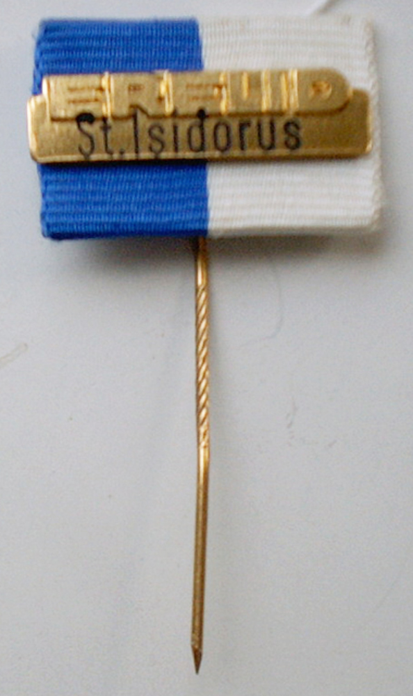 Speld van metaal met de tekst 'erelid Sint Isidorus'