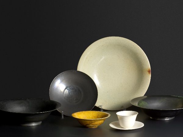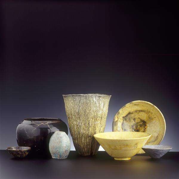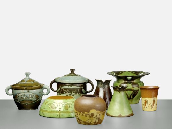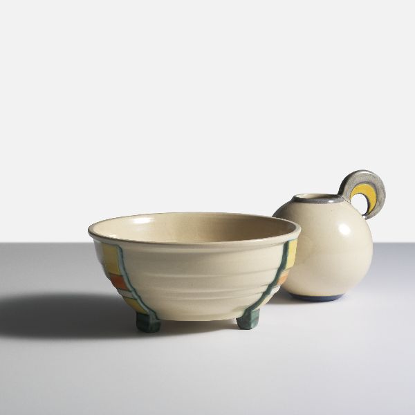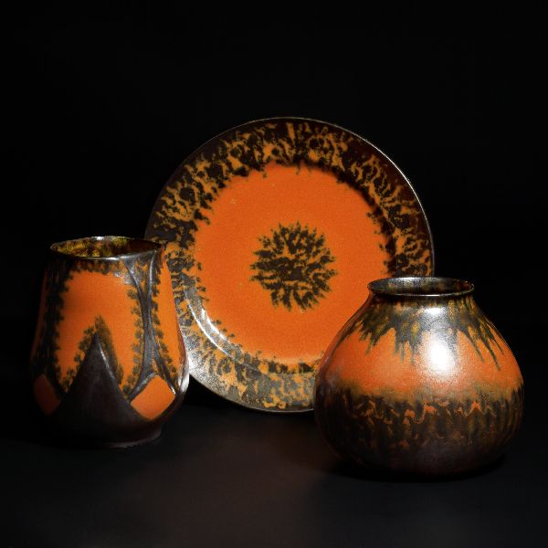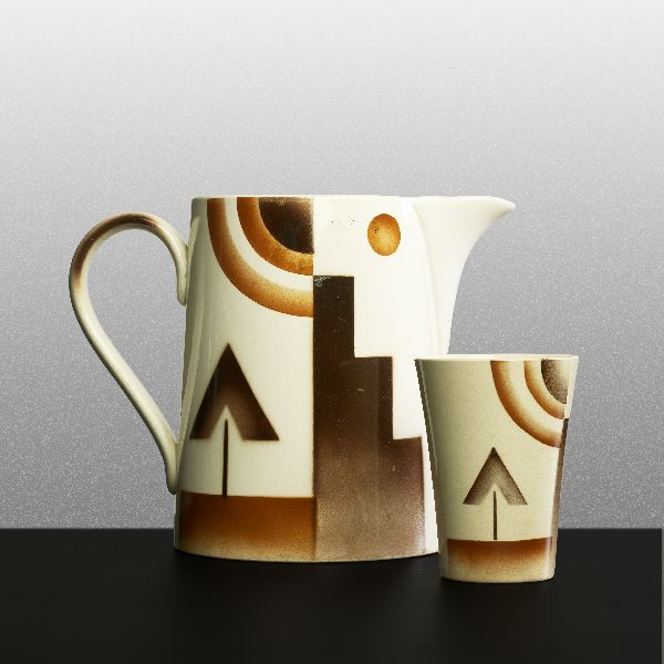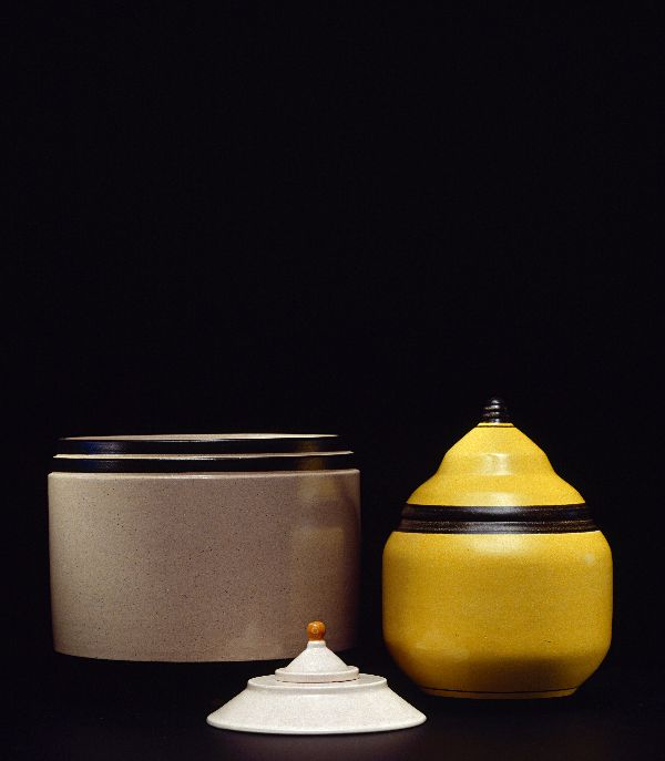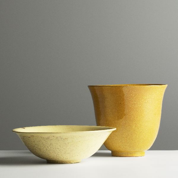 Bekervazen, kom en beker met decoratie in zwart en geel