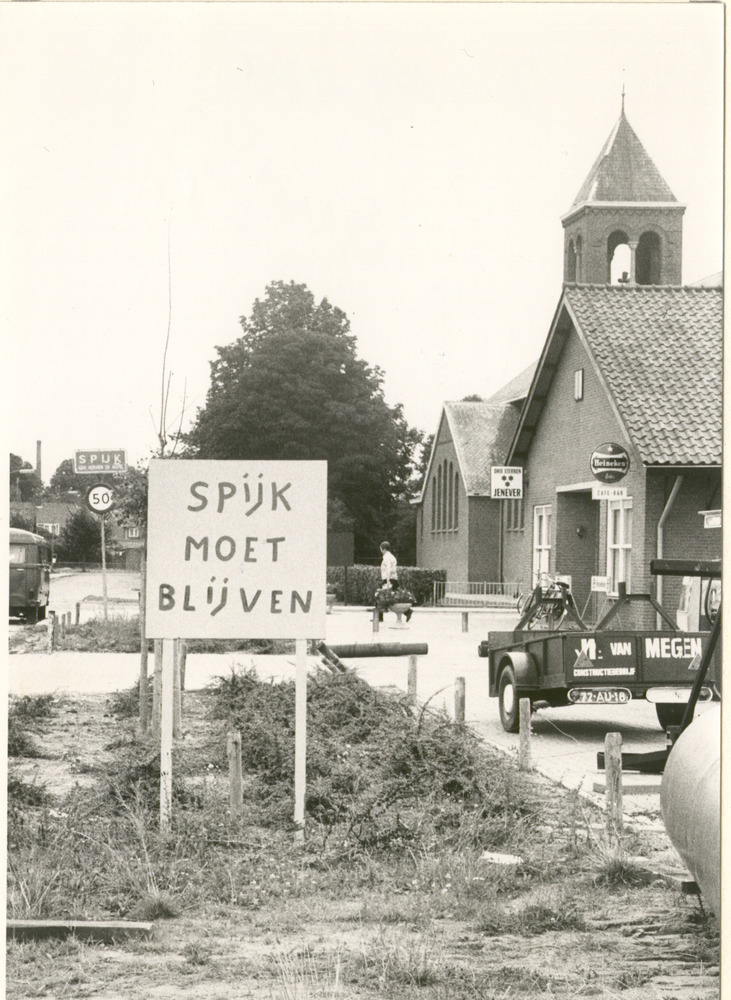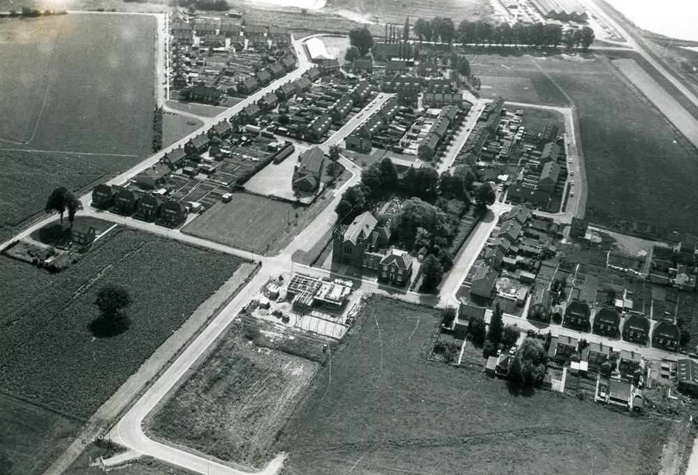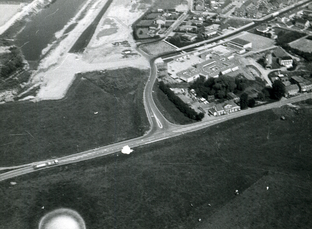 Zwart-wit foto van een luchtopname van Spijk in 1970
