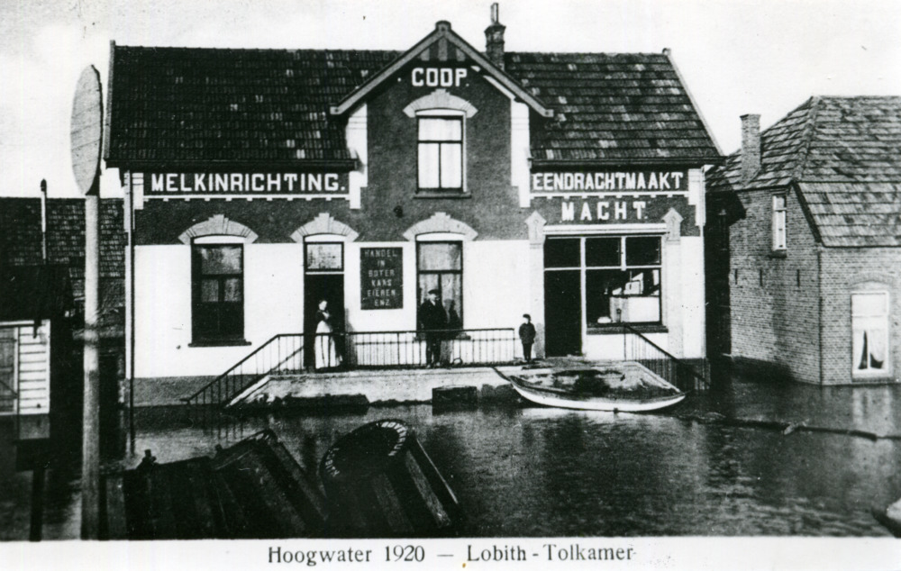 Reproductie van een zwart-wit foto van de Coop. Melk...