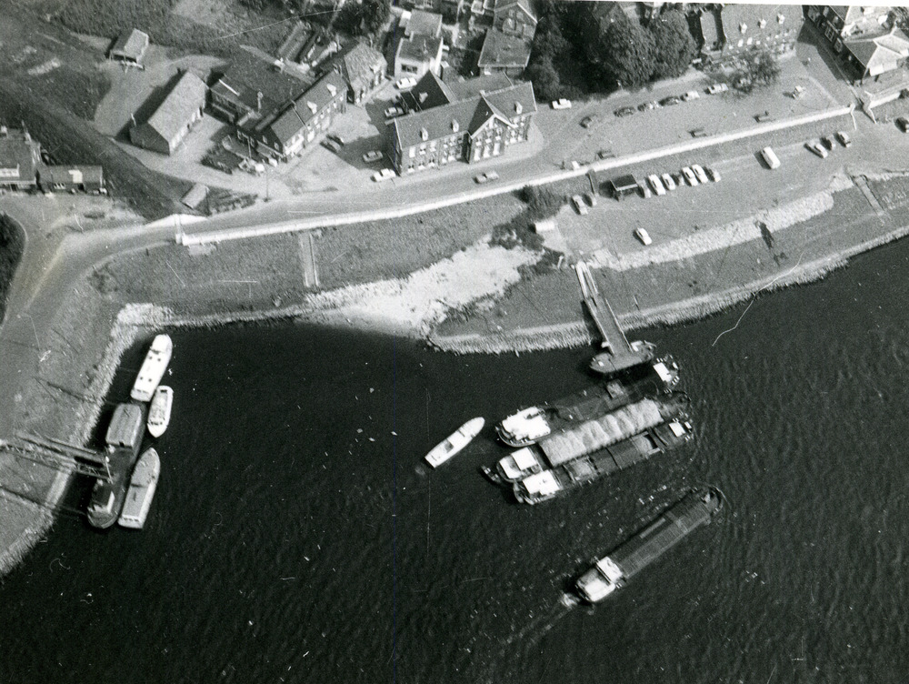Zwart-wit luchtfoto van het dorp Lobith. ca. 1960-1990.