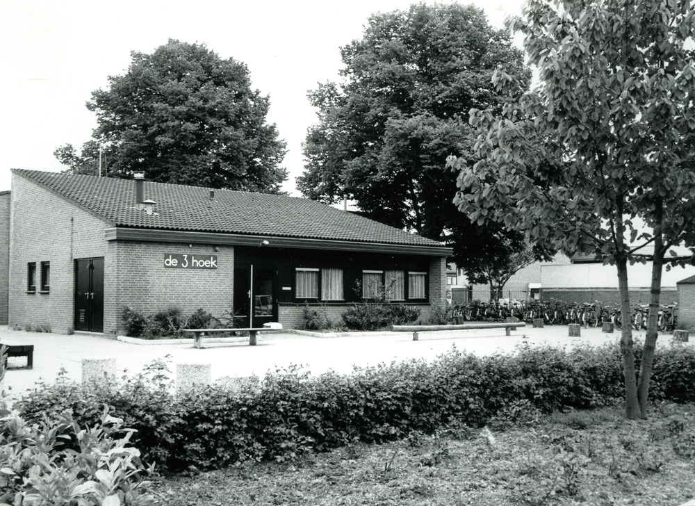 Zwart-wit foto van het buurthuis De Driehoek in Aerd...