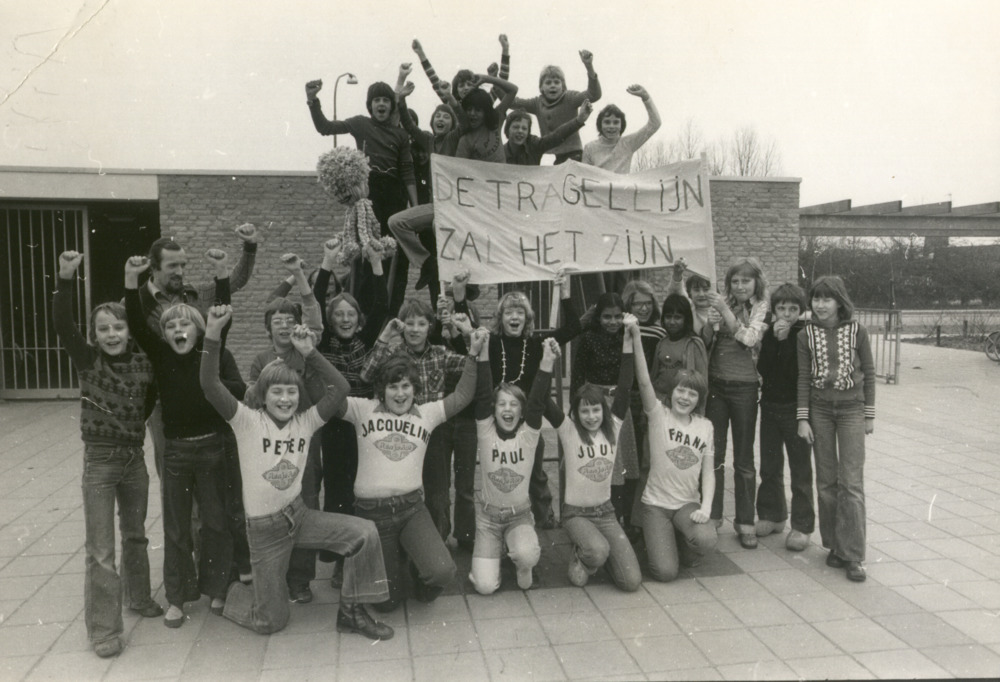Zwart-wit foto van leerlingen voor de school De Trag...