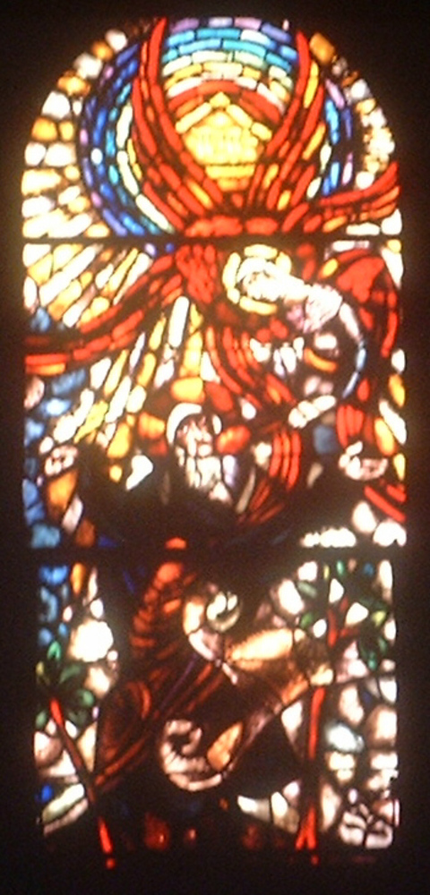 Glasraam in de Huissense stadskerk.De roeping van de...