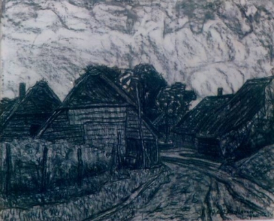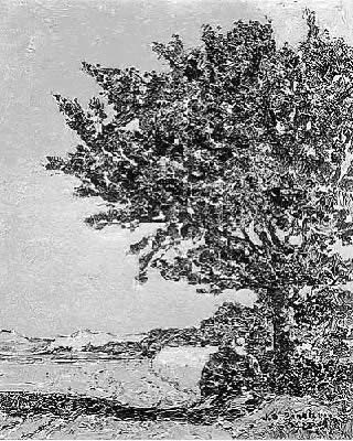 Boerderij met schuur, boom op de voorgrond