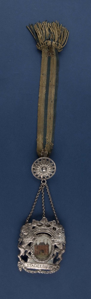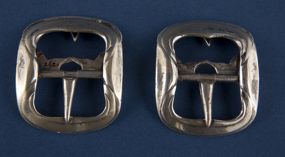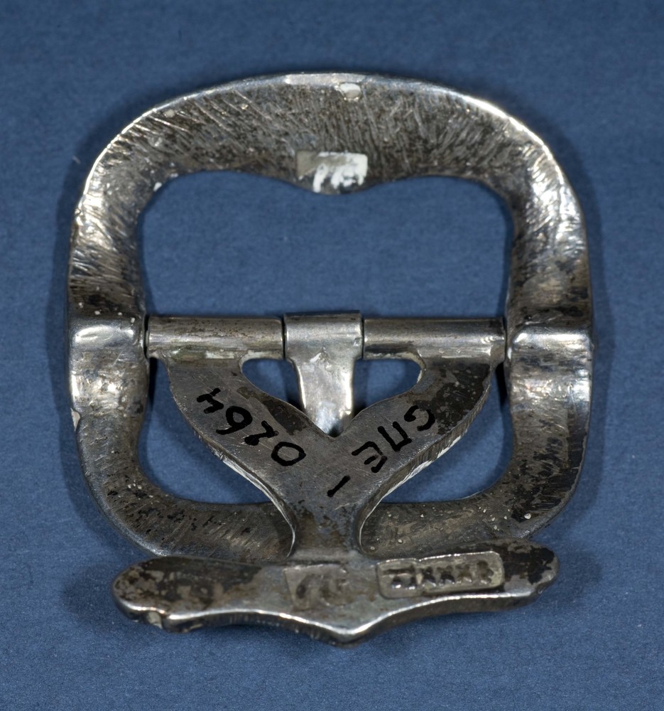 Gesp van zilver met merk, ter bevestiging op een sch...