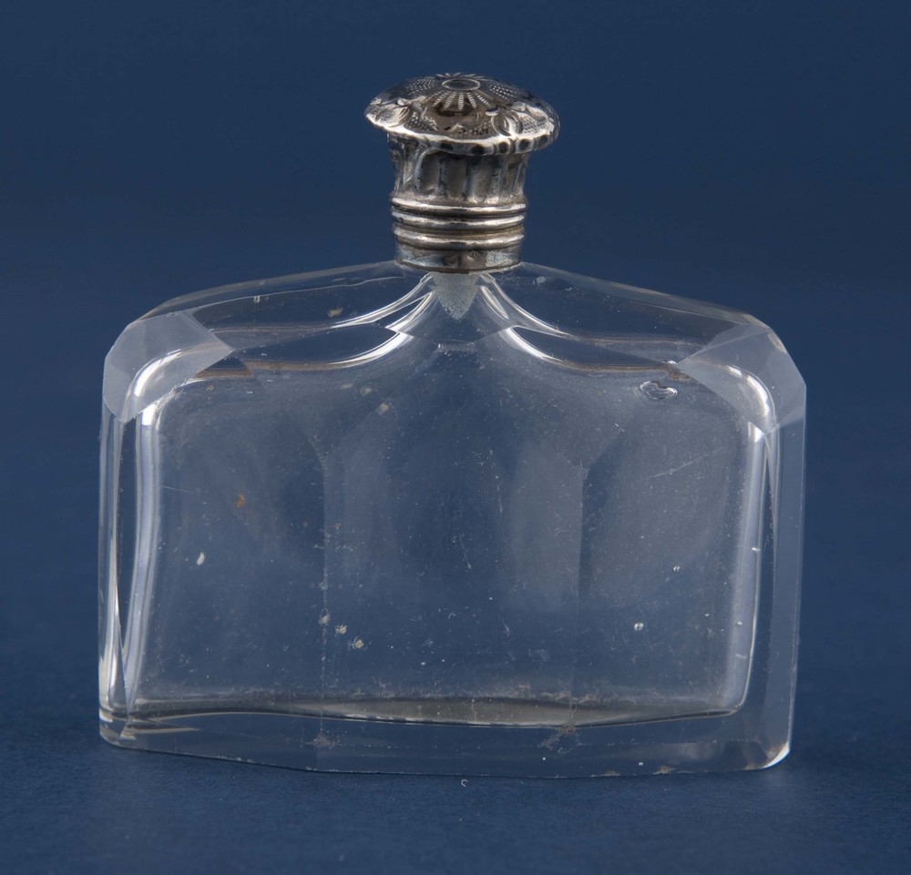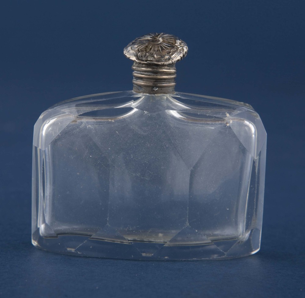Parfumfles van kristalglas met zilveren dop, vervaar...