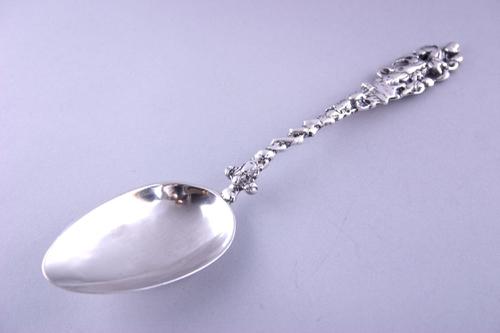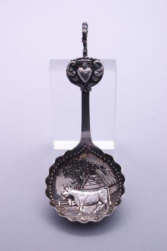 Zilveren roomlepel met afbeeldingen van een koe, boo...