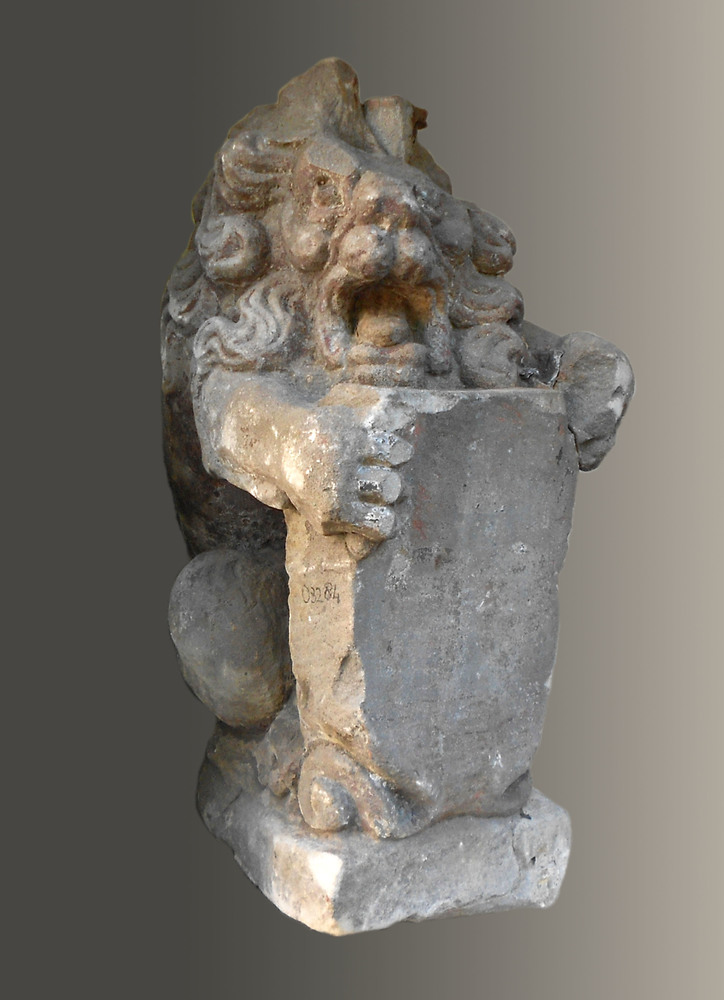 Ornament met op een sokkel een beeld van een leeuw