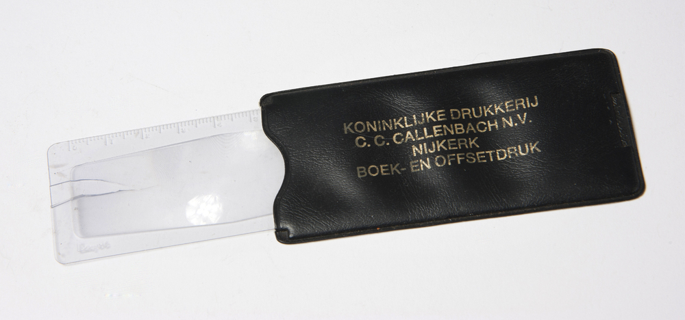 Vergrootglas in etui met opschrift van drukkerij Cal...