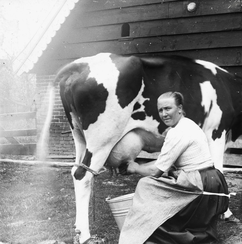 Portret van een vrouw die een koe melkt