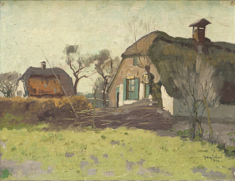 Schilderij met daarop een oud boerderijtje met een s...