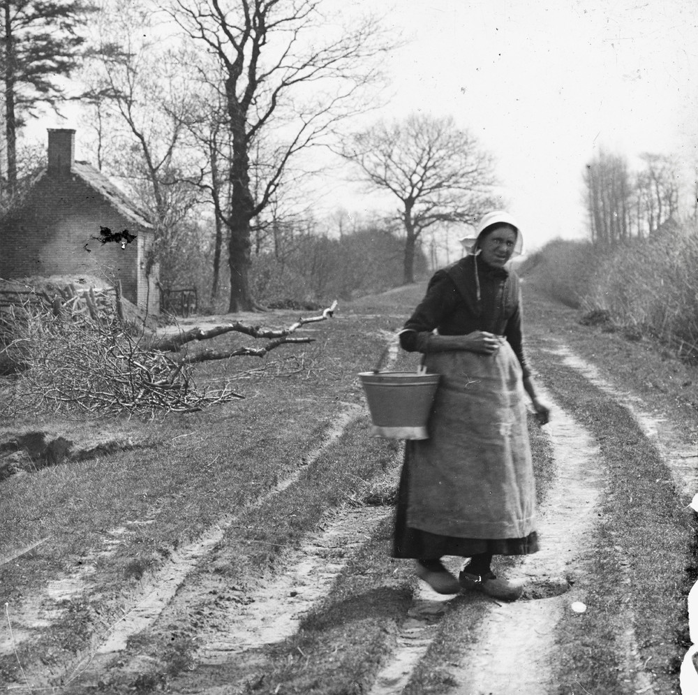 Vrouw in klederdracht op een landweggetje