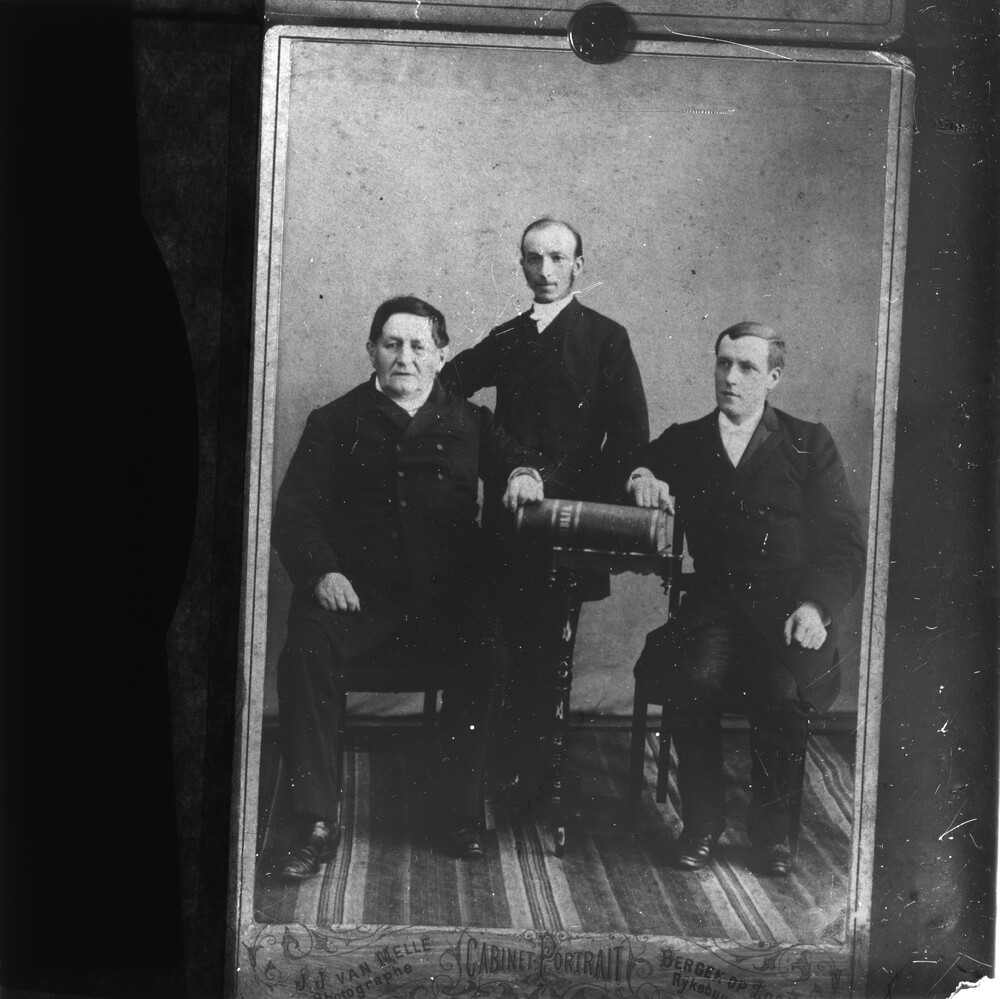 Portret van drie mannen rond een Bijbel