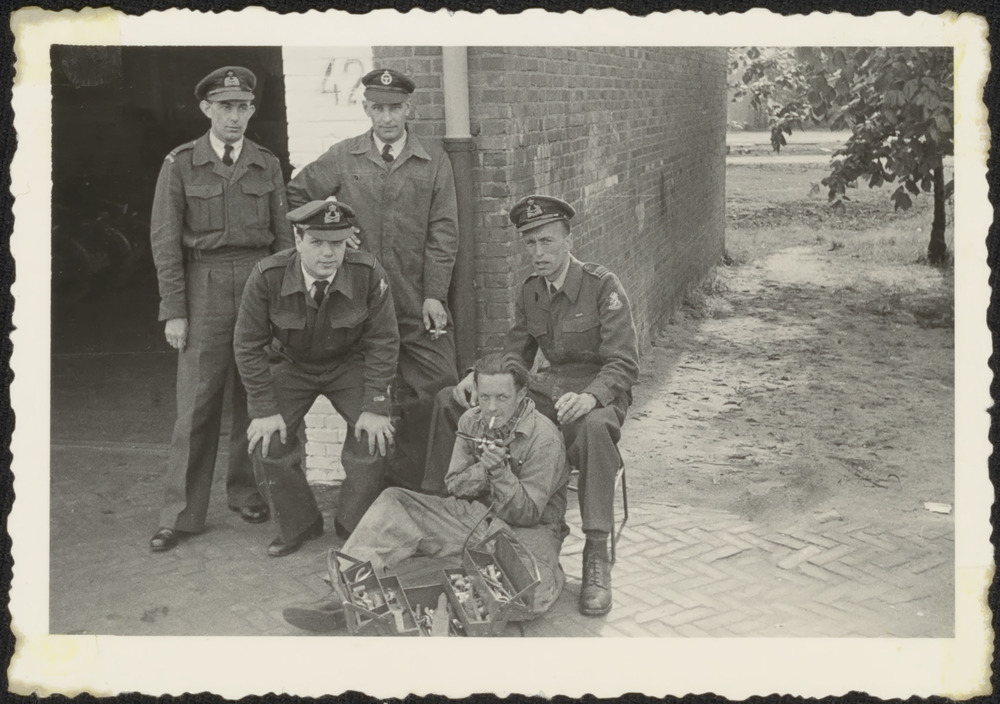 Vijf militairen poseren voor een gebouw