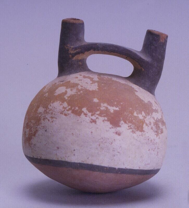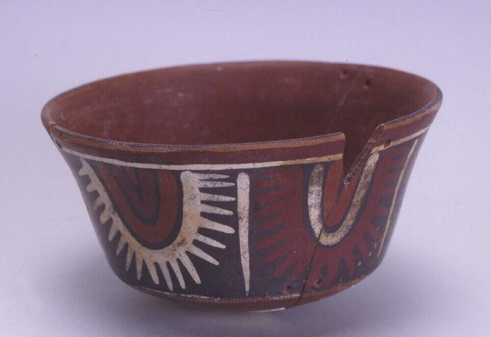 kom met geometrische decoratie en twee dierenkoppen