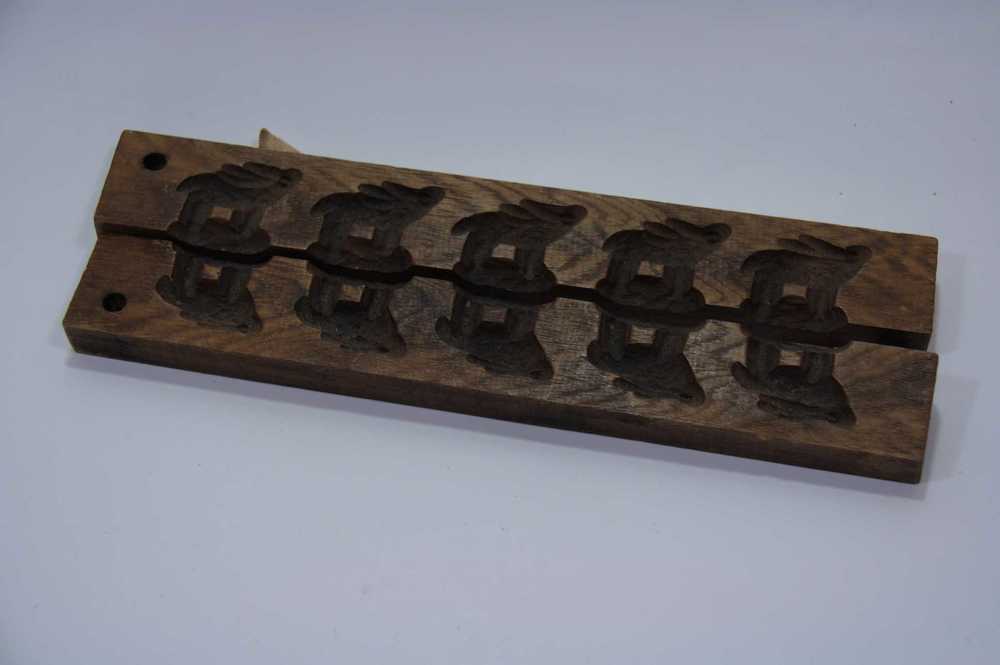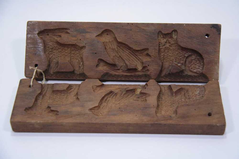 Suikerwerkplank van hout met 7 figuren, o.a. een vog...