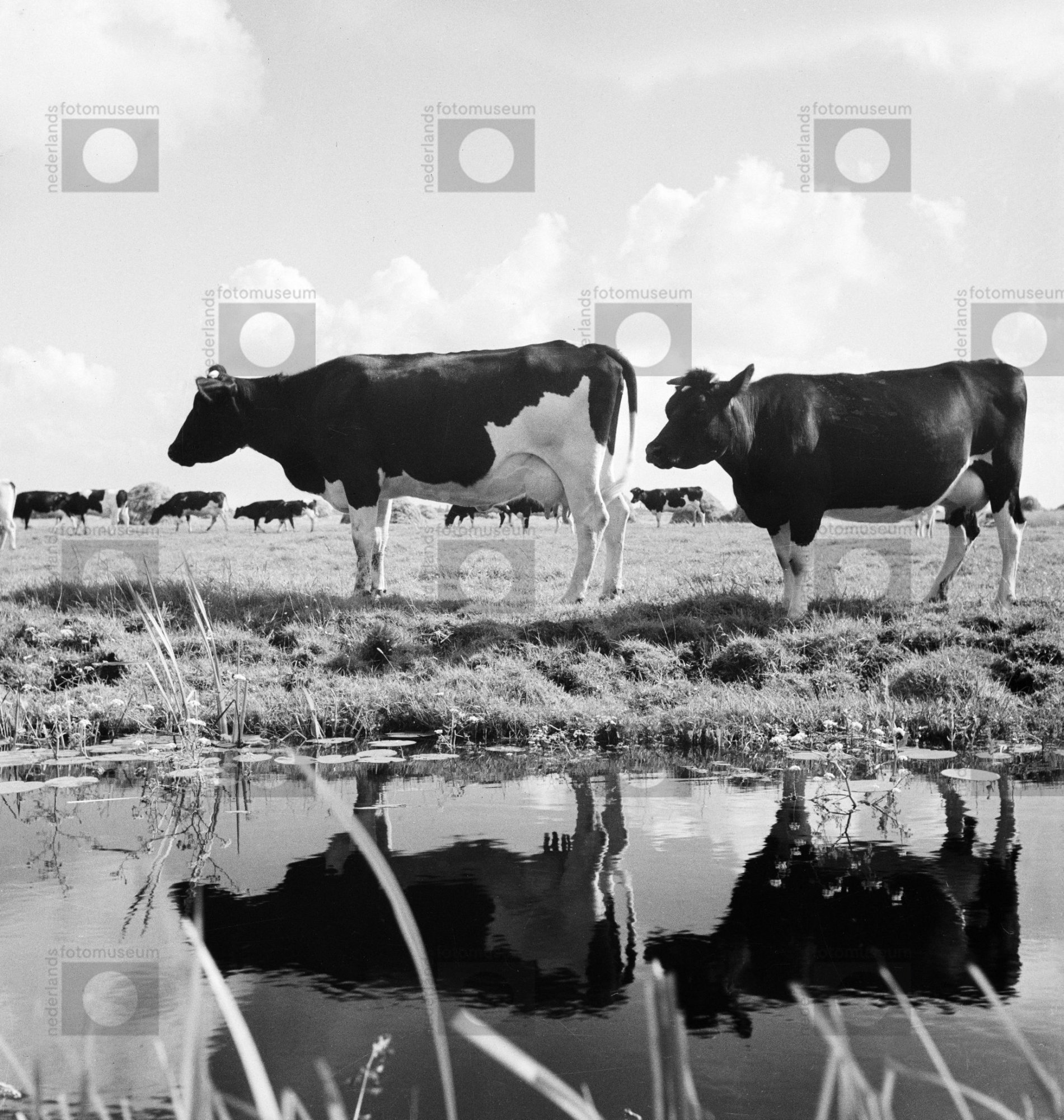 Twwe koeien in een weiland, hun spiegeling in het wa...